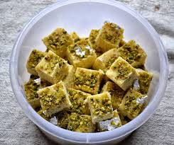 In a pan add mashed paneer, butter and sugar and stir on a low heat for 10-15 minutes. Stir constantly. Add powder milk and stir for another 10 minutes. Add green cardamom powder and chopped pistachios. Grease a plate with little ghee and put the paneer mixture on it. Flatten it with the help of a greased spoon. Let it cool. Cut into desired rectangular or diamond shape.